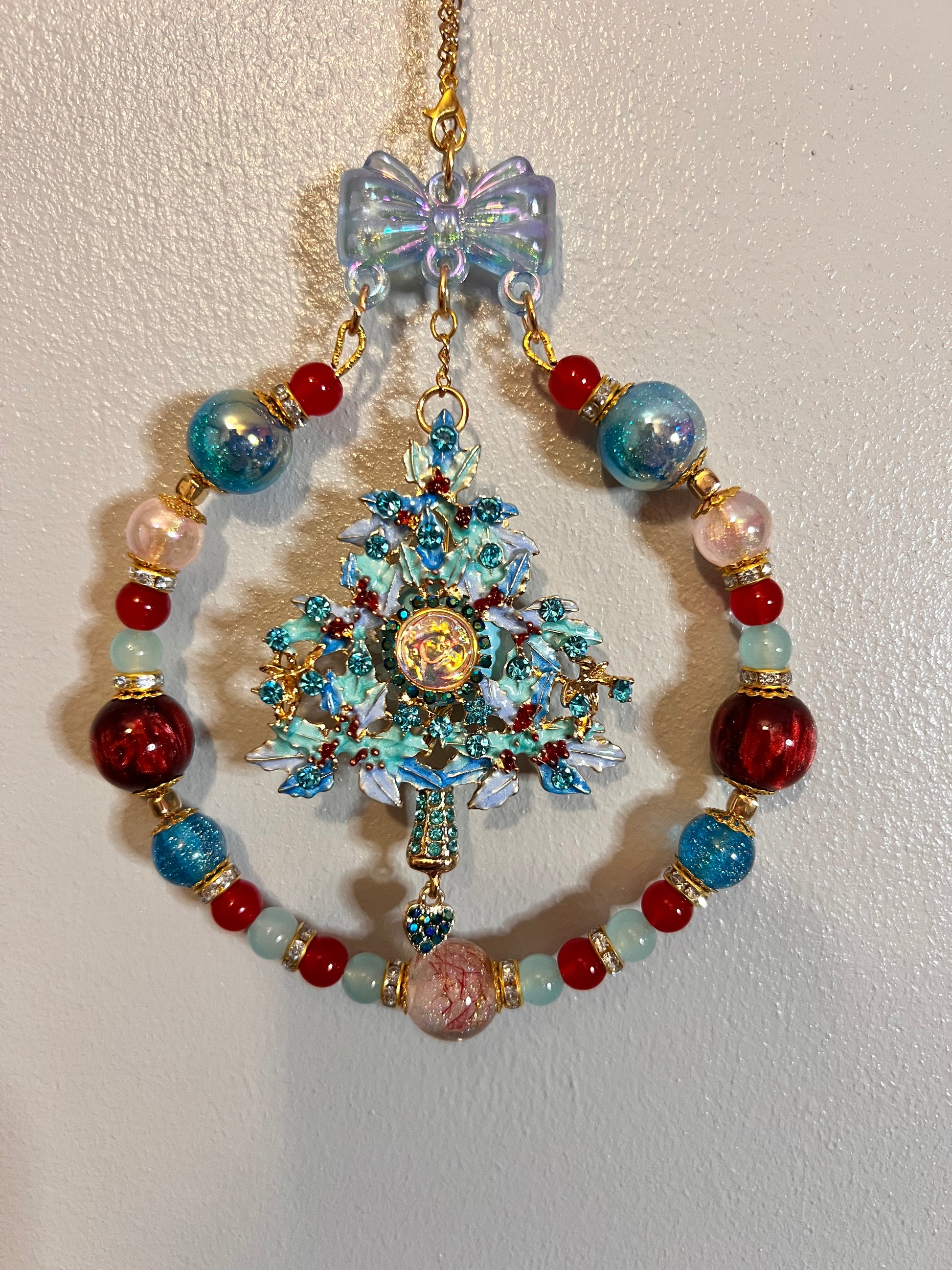 Celebrate the season with a touch of handmade sparkle. Each wall hanger is carefully crafted with shimmering beads, gold accents, and a festive charm centrepiece - from twinkling Christmas trees to joyful stockings and winter blooms. Hung from a delicate chain and finished with a small bow, these ornaments bring warmth and whimsy to any space.